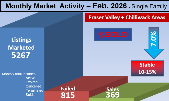 Current: Fraser Valley and the Chilliwack areas in Buyer's Market averaging a 10.5%SOLD rate. See each city link for the full details
