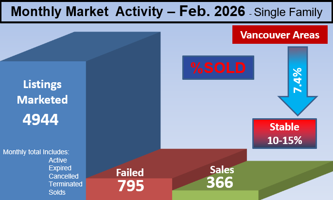 Current: Vancouver area Real Estate Market is in Buyer's with an average of 8.2% SOLD rate. See each city for the full details.